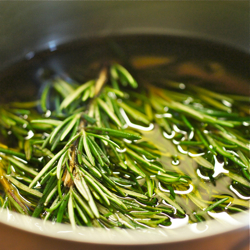 Rosemary oil is simple to make. Blanch one cup of rosemary and spinach separately. Blend everything together with 2 cups of oil. Blend until the oil turns dark green and strain through a cheesecloth or fine mesh strainer.