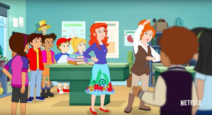 That was… Different, yeah let’s go with that. As we see, Ms. Frizzle is hanging it up by the looks of it and handing the keys over to her sister. Ms…… Frizzle, minus the frizz? There is a bit going on here. I do not know where this falls in the timeline, but it looks like the gang is all here for this series. We have not got confirmation if they are the same kids, but you can clearly see similarities from this class to the group we knew and loved.